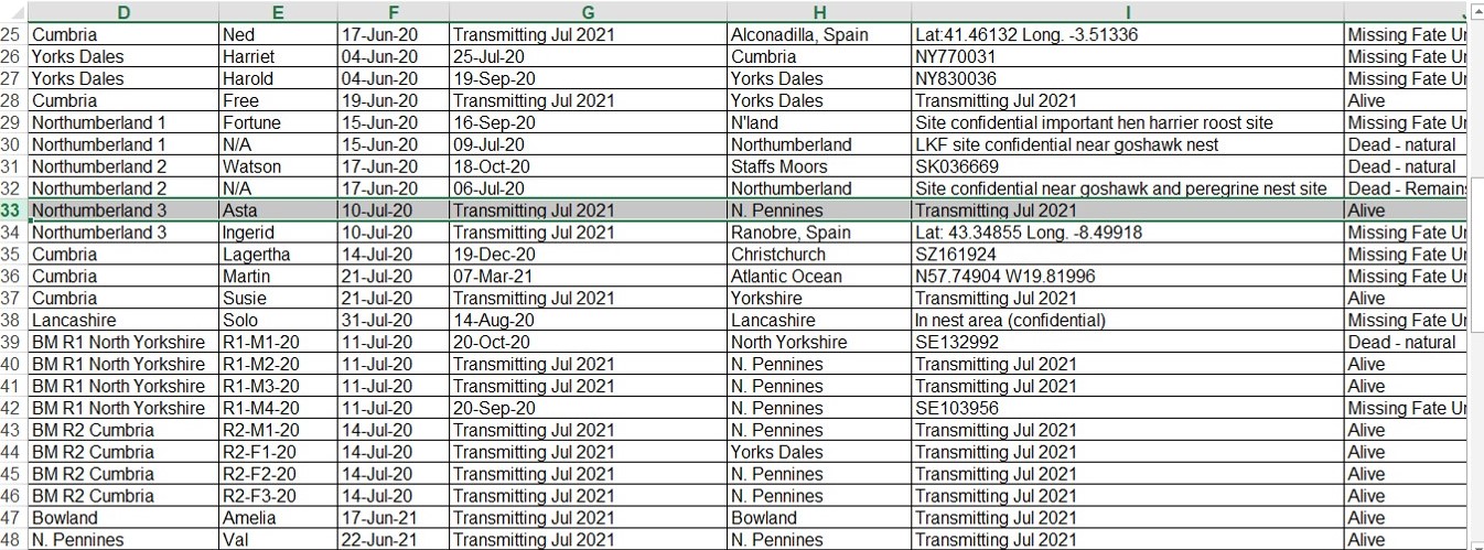 I also noticed that in its summer 2021 update on its satellite-tagged hen harriers, Natural England stated that Asta’s tag was still transmitting in July 2021 and her status was listed as ‘alive’, when actually she was dead three months earlier: