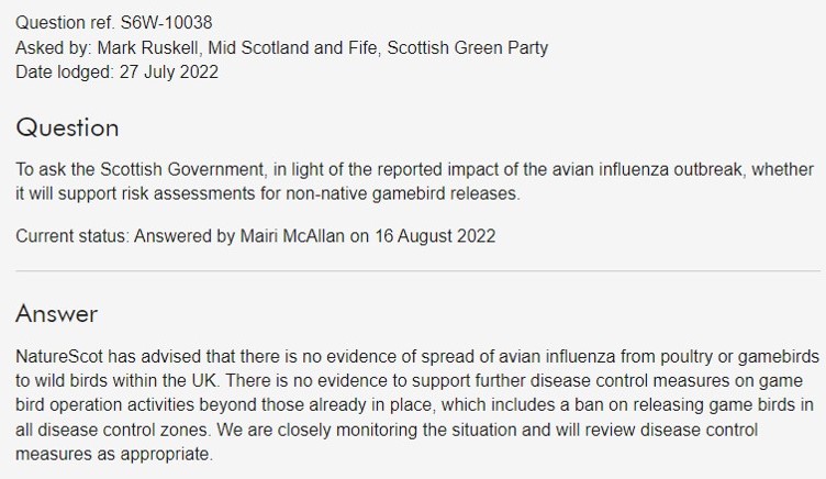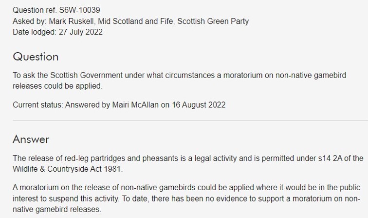 Mark Ruskell also asked under what circumstances a moratorium on gamebird releases would be considered by the Scottish Government. The answer? ‘Where it would be in the public interest’. That hasn’t been defined either: