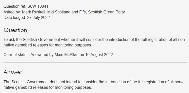 And if you look at the Minister’s next response, that ‘close monitoring’ looks even more unlikely given that the Government is not considering, nor does it intend to consider, a full registration scheme of all non-native gamebird releases: