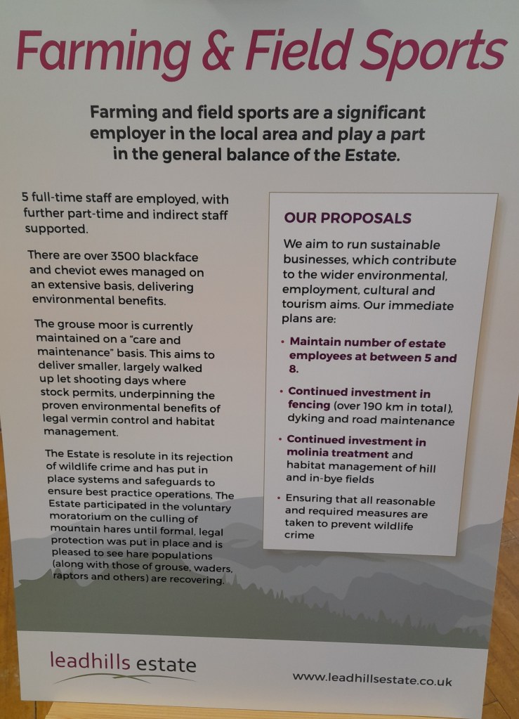 And given some of the statements published on information boards at yesterday’s meeting (see below), it’d hard to keep a straight face when you know that Leadhills Estate is currently serving not one, but TWO General Licence restrictions after the police found ‘clear evidence’ of wildlife crime (see here & here), just the latest in an astonishingly long list (at least 70 reports of alleged raptor persecution there since the early 2000’s).