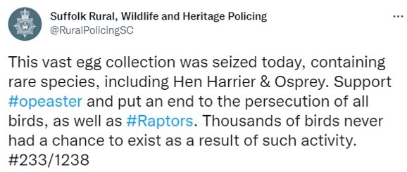 Suffolk Police’s Rural, Wildlife & Heritage Team has seized what it describes as a ‘vast’ egg collection in Halesworth. The haul is thought to include clutches of hen harrier and osprey eggs.