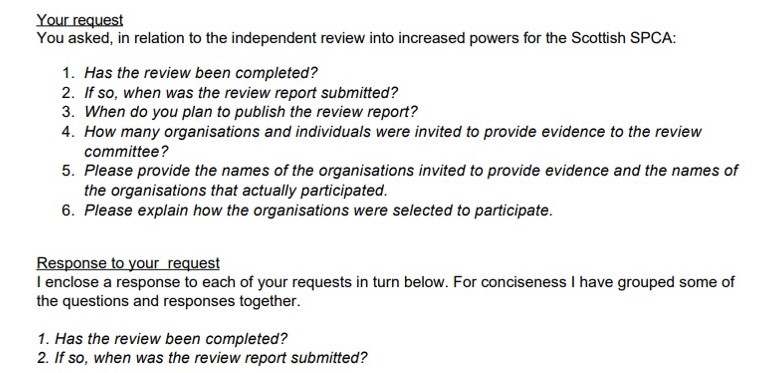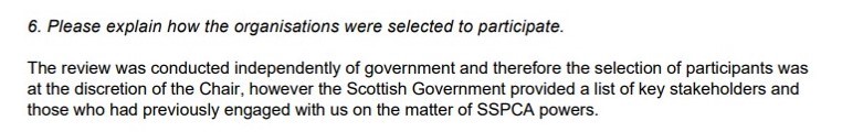 I’ve gone back to the Scottish Government to ask for the ‘key list of stakeholders and those who had previously engaged with [the Scottish Government] on the matter of SSPCA powers‘ that was provided to the Taskforce Chair, to determine whether this bias was determined by the Scottish Government or by the Taskforce Chair.