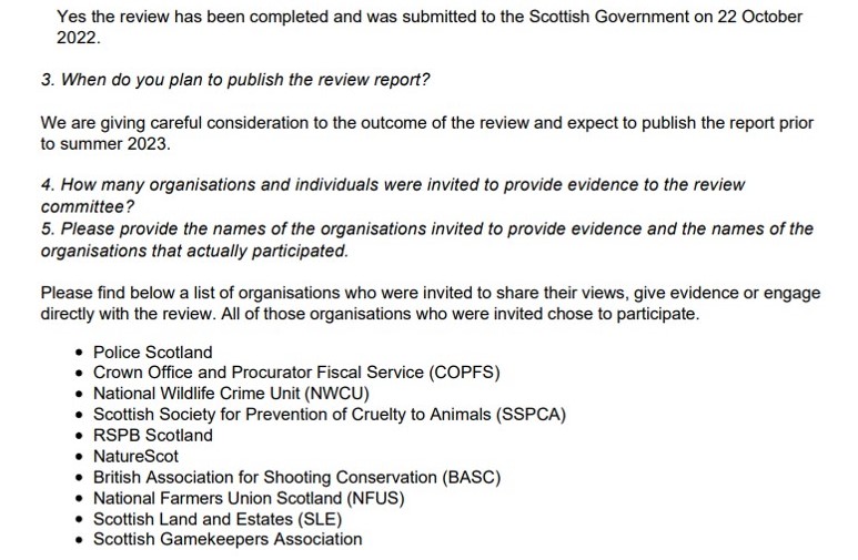 I also asked the Scottish Government some questions about which organisations and individuals were invited and had contributed evidence to the Taskforce review. The answer is alarming to say the least, with invited participants heavily weighted to the game-shooting industry: