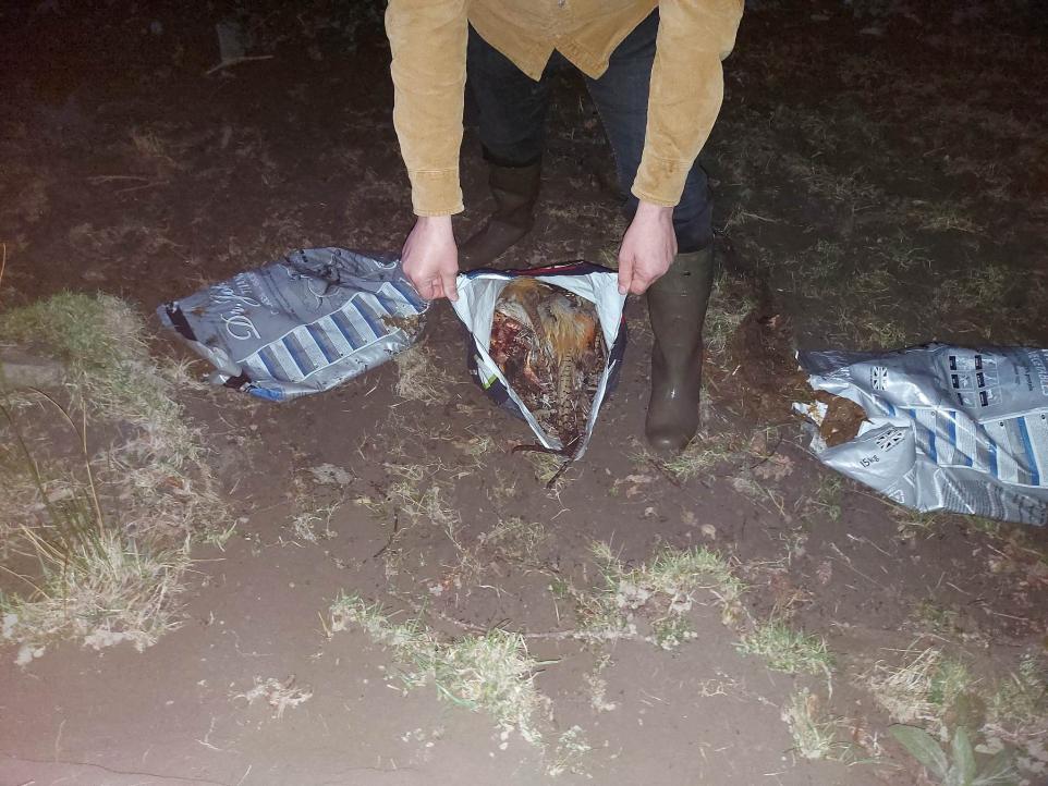 The first nine sacks were found on 14th February, seemingly thrown from a bridge near Glantwymyn, probably in the hope they’d be washed out to sea. However, likely due to the weight of the dead birds in the sacks and the low river flow, they stayed put.
