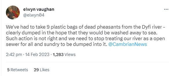 The fact that there is evidence of similar offences occurring nationwide would suggest this is not an issue peculiar to Wales. I would also suggest that this dumping of dead pheasants in the river is a symptom of the underlying criminal behaviour displayed by some of the people linked to game bird shooting, and also includes raptor persecution and other wildlife crimes.