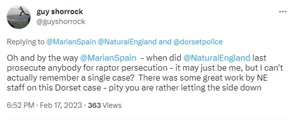 And as for ‘prosecuting offenders‘, I think Guy Shorrock’s tweet says it all (Guy, a now-retired RSPB Investigator, worked for 30 years in this field so I think he’s well placed to ask the question):