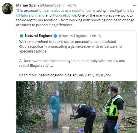 She came in for some criticism from others on Twitter for failing to mention the other partners involved with this successful prosecution, notably the RSPB, just as Dorset Police had failed to acknowledge their involvement. Although in Marian’s case I doubt this was a deliberate, petty and vindictive move, unlike Dorset Police’s probable motivation.
