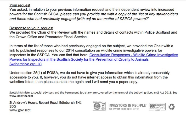 A Freedom of Information request had revealed that the non-governmental organisations that had been invited to contribute evidence to the review (Scottish Gamekeepers Association, Scottish Land & Estates, British Association for Shooting & Conservation, and the National Farmers Union Scotland) greatly outweighed the number of conservation/animal welfare organisations invited to participate (limited to the RSPB).