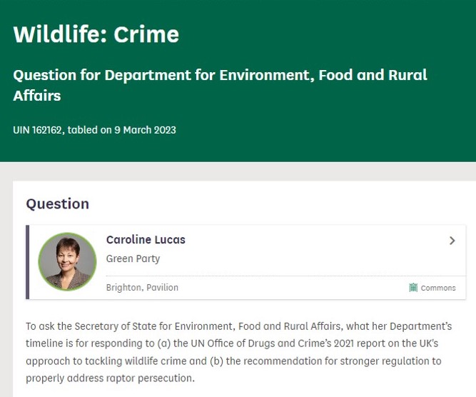 There have been a number of written Parliamentary questions in recent weeks relating to wildlife crime, and particularly to addressing raptor persecution.