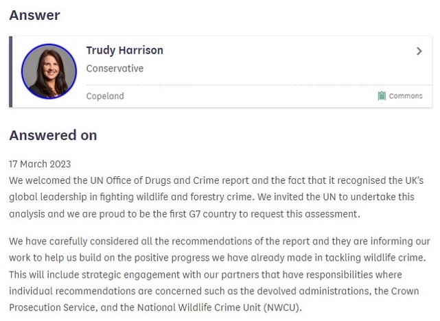 The report to which Caroline is referring is the UN Office of Drugs and Crime’s Wildlife and Forest Crime Analytical Toolkit Report: United Kingdom of Great Britain and Northern Ireland (2021), which is basically a comprehensive review of the prevalence of wildlife crime in the UK and an assessment of judicial responses. The report provides a series of recommendations that the UK and devolved Governments could implement to better address the issues.
