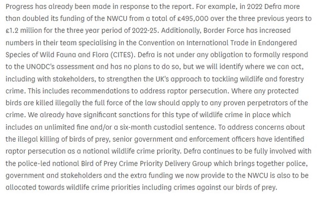Harrison says:Defra continues to be fully involved with the police-led national Bird of Prey Crime Priority Delivery Group which brings together police, government and stakeholders“.