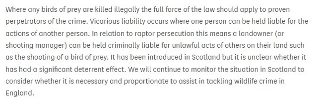 Harrison/DEFRA says: “[Vicarious liability] has been introduced in Scotland but it is unclear whether it has had a significant deterrent effect. We will continue to monitor the situation in Scotland to consider whether it is necessary and proportionate to assist in tackling wildlife crime in England“.