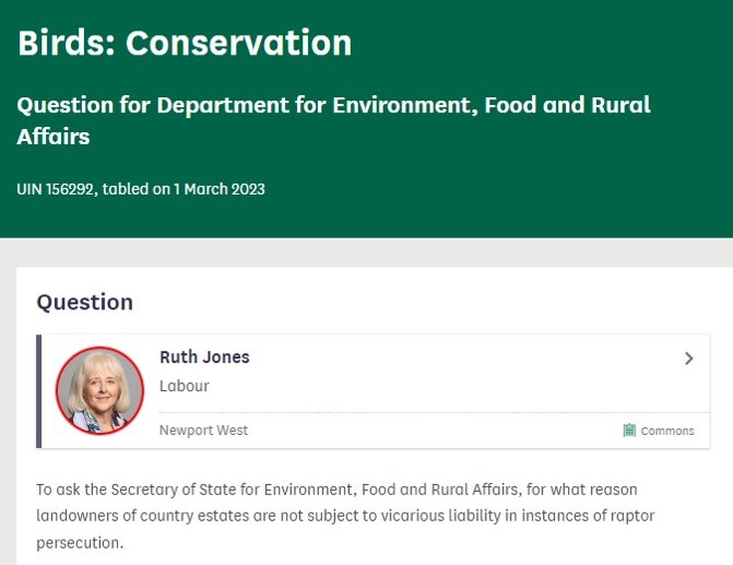 Here are some more parliamentary questions relating to the Westminster Government’s failure to effectively tackle raptor persecution, this time submitted by Ruth Jones MP (Labour, Shadow Minister at DEFRA).
