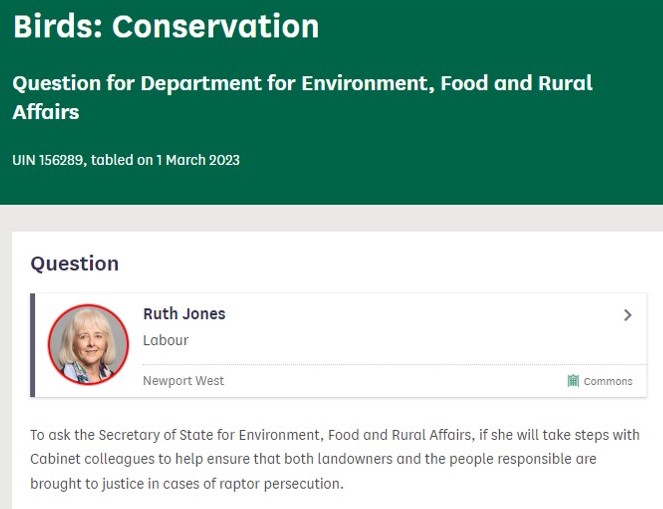 Here are some more parliamentary questions relating to the Westminster Government’s failure to effectively tackle raptor persecution, this time submitted by Ruth Jones MP (Labour, Shadow Minister at DEFRA).