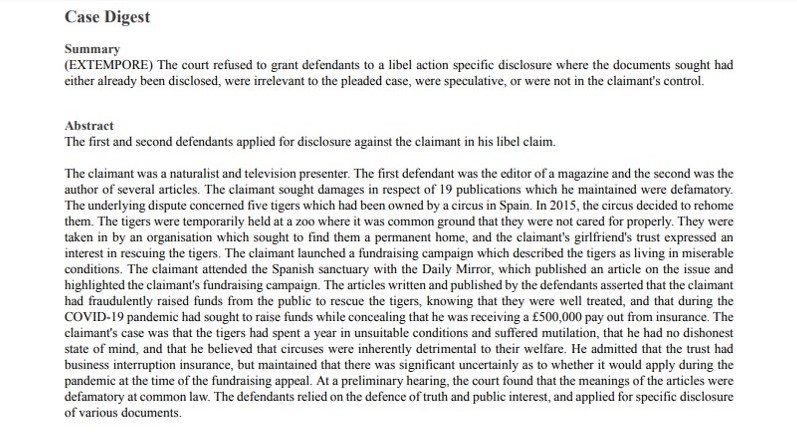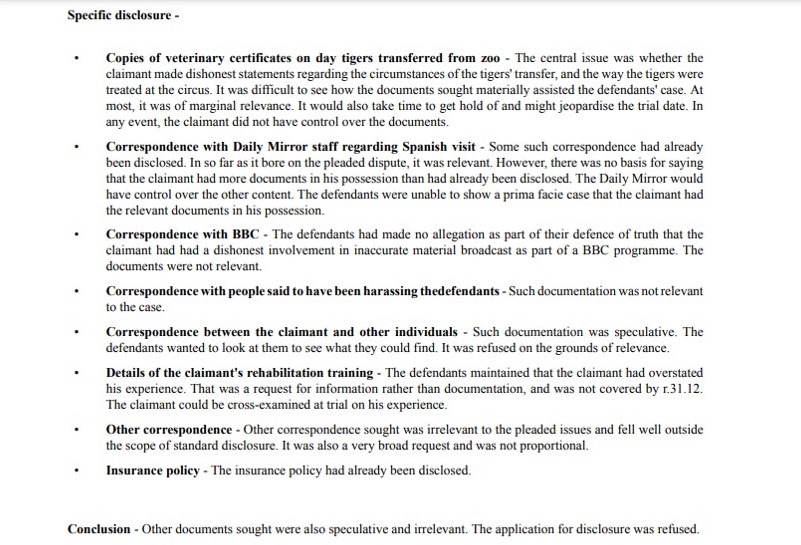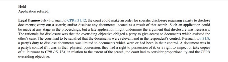 In response, Chris’s lawyers argued that Chris had provided all disclosable documents not covered by legal professional privilege and that the further documents requested were either irrelevant to the defendant’s case as pleaded, had already been provided, or were not in his control.