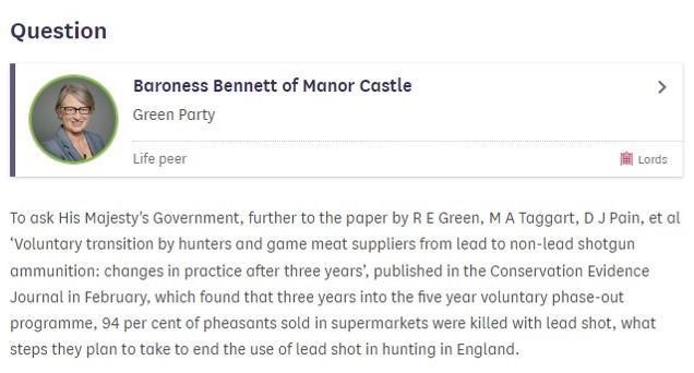 Last month, Green Party Life Peer Natalie Bennett lodged a parliamentary question for DEFRA to answer, asking what steps the Government plans to take to end the use of toxic lead shot given the gamebird-shooting industry’s continued failure to do it voluntarily.