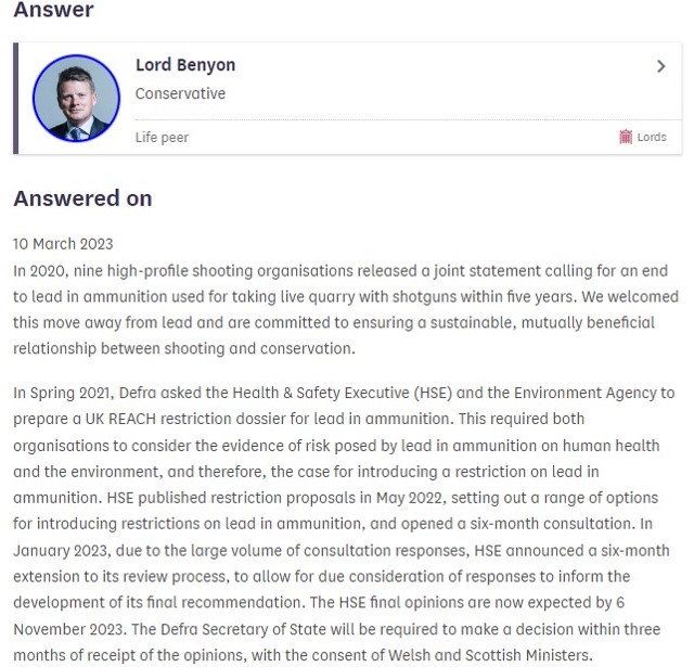 DEFRA Minister responds to question on gamebird industry’s failure to stop using toxic lead ammunition