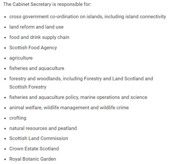 The Land Reform portfolio appears to have been transferred to Mairi Gougeon. Prior to the reshuffle, Mairi Gougeon was the Cabinet Secretary for Rural Affairs and Islands. Her new title is Cabinet Secretary for Rural Affairs, Land Reform and Islands. Her new, expanded portfolio is listed as follows: