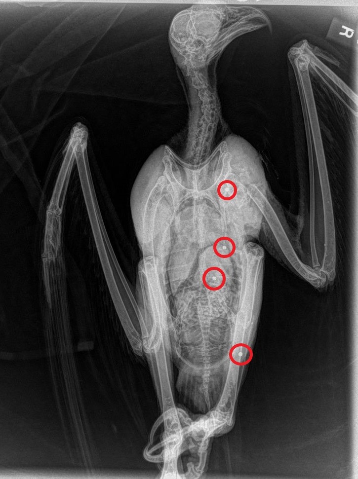 However, the article goes on to claim that the Osprey was ‘shot three times with an airgun‘, but if you look at the x-ray it’s pretty clear that the Osprey has been hit by shotgun pellets (at least four of them – I’ve circled them on the x-ray image below), and not by airgun pellets, which have a distinctively different shape.