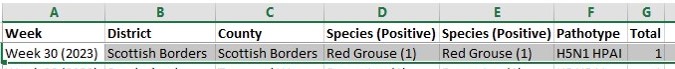 The spreadsheet entry states that H5N1 was detected in a red grouse in week 30 (July 24 – July 30 2023) in the Scottish Borders: