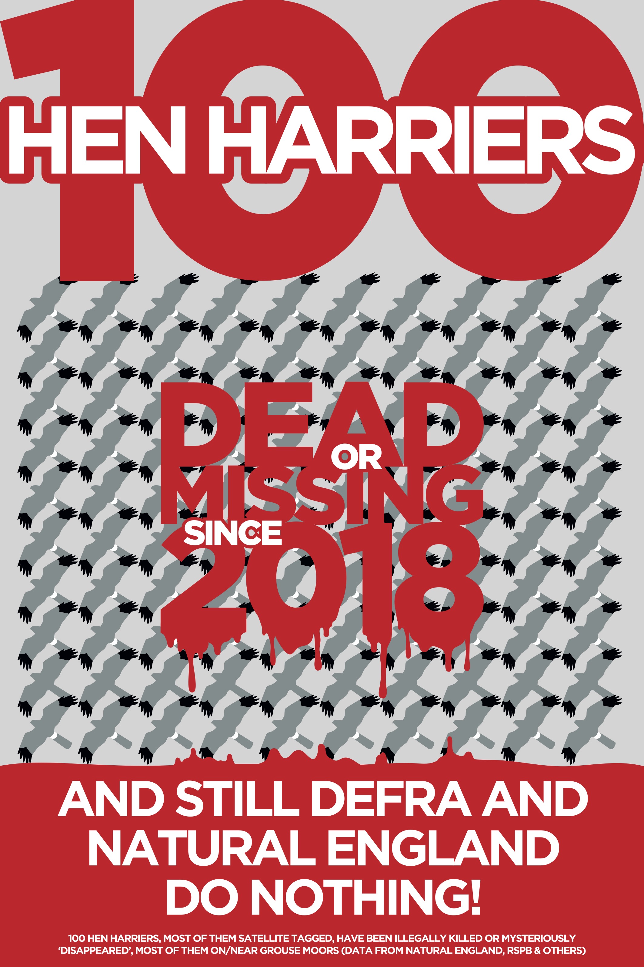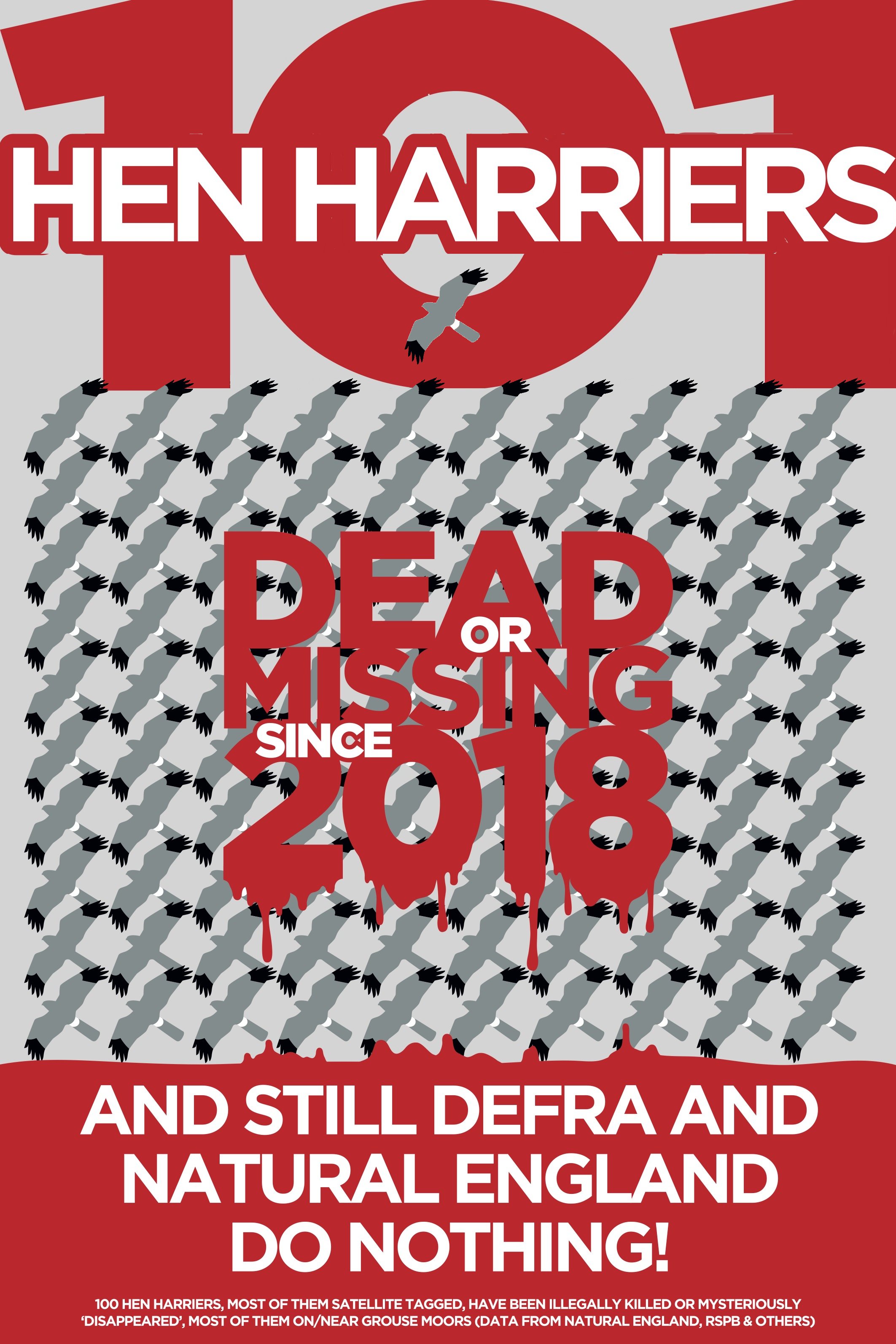 Wild Justice designed this poster in preparation for marking the 100th hen harrier to go ‘missing’/be killed since 2018. But the grouse shooting industry is killing harriers faster than we can make graphics….we’re now up to 101 hen harriers (actually we’re well past that figure but the other cases are yet to be publicised).
