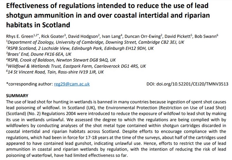 Here’s the full paper on the significant non-compliance of the law by shooters in Scotland, who are still using toxic lead shotgun ammunition to kill birds over wetlands, 18 years after it was banned. Well worth a read: