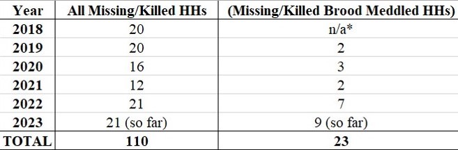 Harmonia brings the total number of ‘missing’/killed hen harriers (that are known about) to 21 this year, which is the equal highest number since brood meddling began in 2018. The grand total of ‘missing’/killed hen harriers since brood meddling began in 2018 is now 110 birds, and of those, 23 were brood meddled birds.