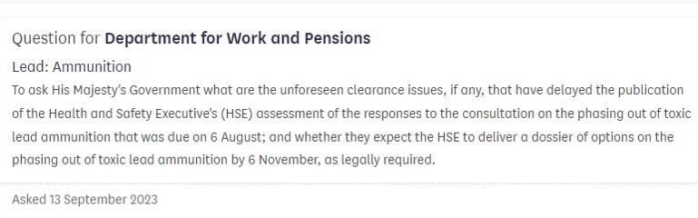 It’s worth remembering that the DEFRA Secretary of State (currently Therese Coffey) is legally required to make a decision on the phasing out of toxic lead ammunition within three months of receiving the opinion report from HSE.