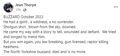 Two days ago I wrote about a buzzard that had been shot and critically injured in the North York Moors National Park – the latest in a long line of victims in that grouse moor-dominated landscape (see here).