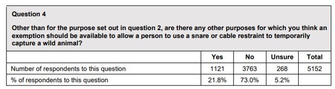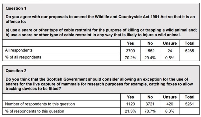 Given the preliminary analysis of the responses made to the Scottish Government’s recent public consultation on the use of snares, it is also very clear that the public supports a ban on the use of all snares and does not support any exceptions to the ban: