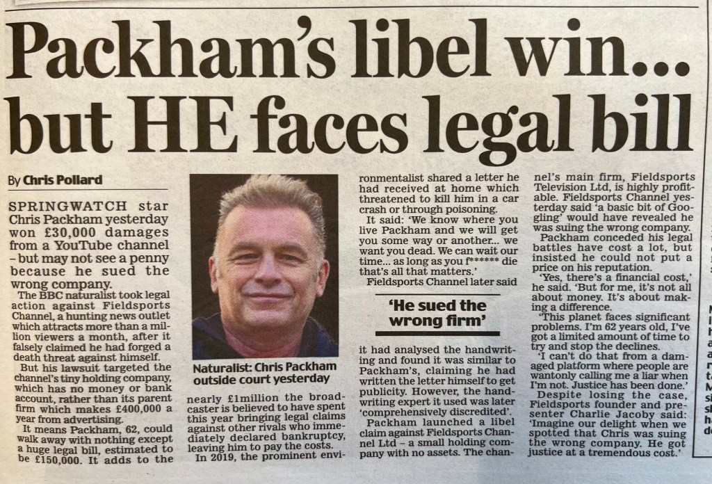 UPDATE 28th November 2023: Daily Mail published apology to Chris Packham for inaccurate reporting of his libel win against Fieldsports Channel Ltd here