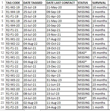 Of the 41 brood meddled hen harriers, 23 are ‘missing’ / dead, according to data held by Natural England (data from September 2023 onwards not yet available):