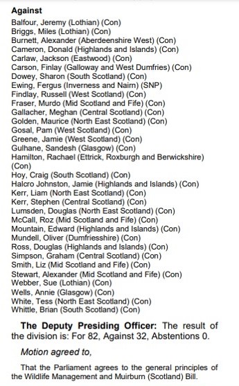 1. On analysing who voted all 31 Conservative MSP turned out to vote and most of then had constituency nowhere near the areas of wildlife persecution. Shame on the Conservative Party and as for Fergus Ewing its well known he is a friend of the SGA.