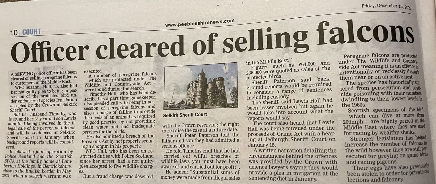 UPDATE 12 February 2024: Part-time gamekeeper Timothy Hall and his son Lewis Hall avoid custodial sentence for laundering of wild peregrines in Scotland (here)