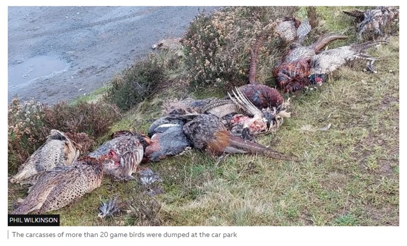 According to this BBC article, on Tuesday morning dog walkers and ramblers found the corpses of ‘about 20 pheasants and a number of ducks’ that had been dumped in a moorland car park above Lauder.