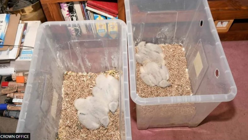 Some of the young stolen Peregrine chicks found at Timothy Hall’s address during multi-agency raid in 2021 (Photo via COPFS). The chicks were later fostered back to wild nest sites.