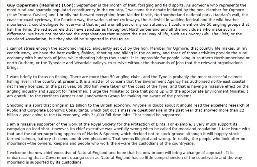As well as being a Government Minister, Opperman is the Conservative MP for Hexham in Northumberland, a constituency that includes a number of grouse moors in the North Pennines AONB (now re-named a National Landscape) and Northumberland National Park.