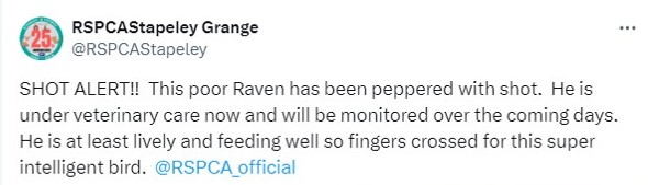 A raven with at least five shotgun pellets lodged in its body is currently receiving veterinary care at the RSPCA’s Stapeley Grange Wildlife Centre in Cheshire, according to this tweet posted yesterday evening: