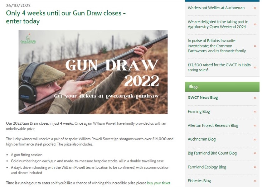 And pro-game shooting charity Game and Wildlife Conservation Trust (GWCT) certainly wouldn’t be accepting generous raffle prizes worth a value of tens of thousands of pounds from any company even suspected of having a link to raptor persecution – see here and: