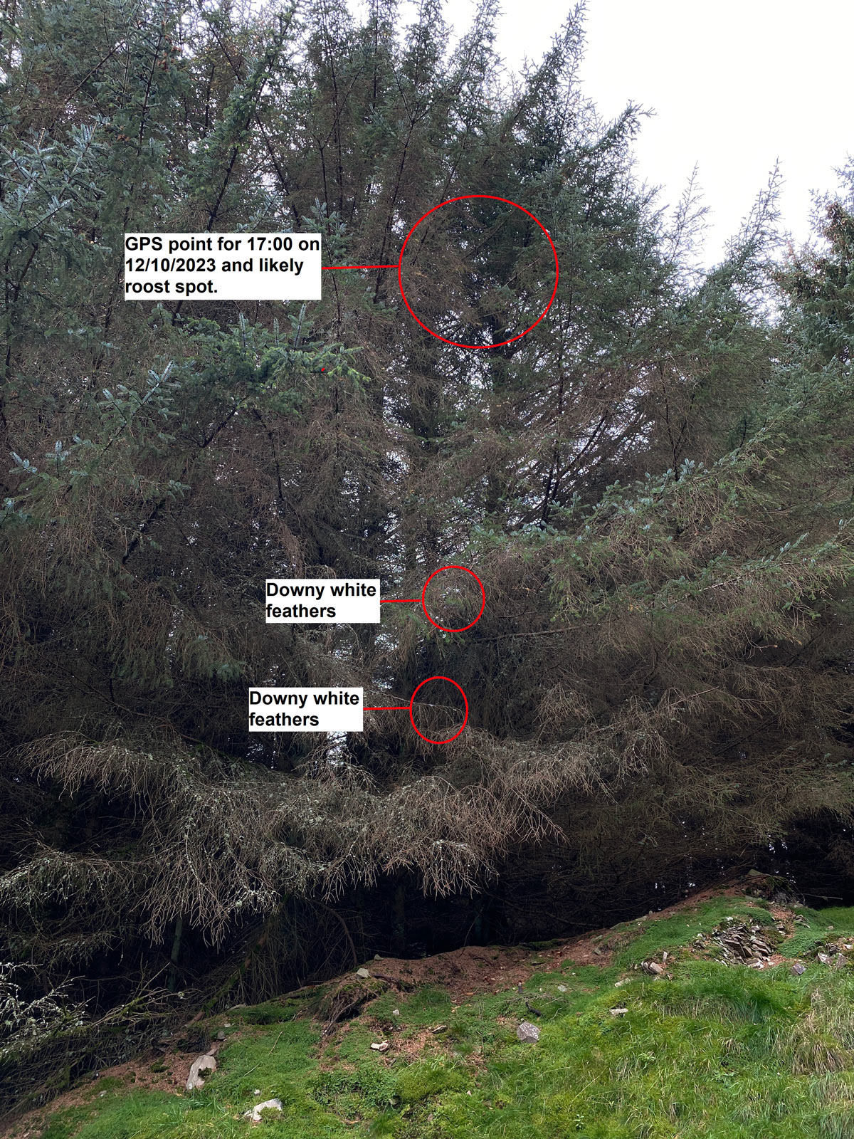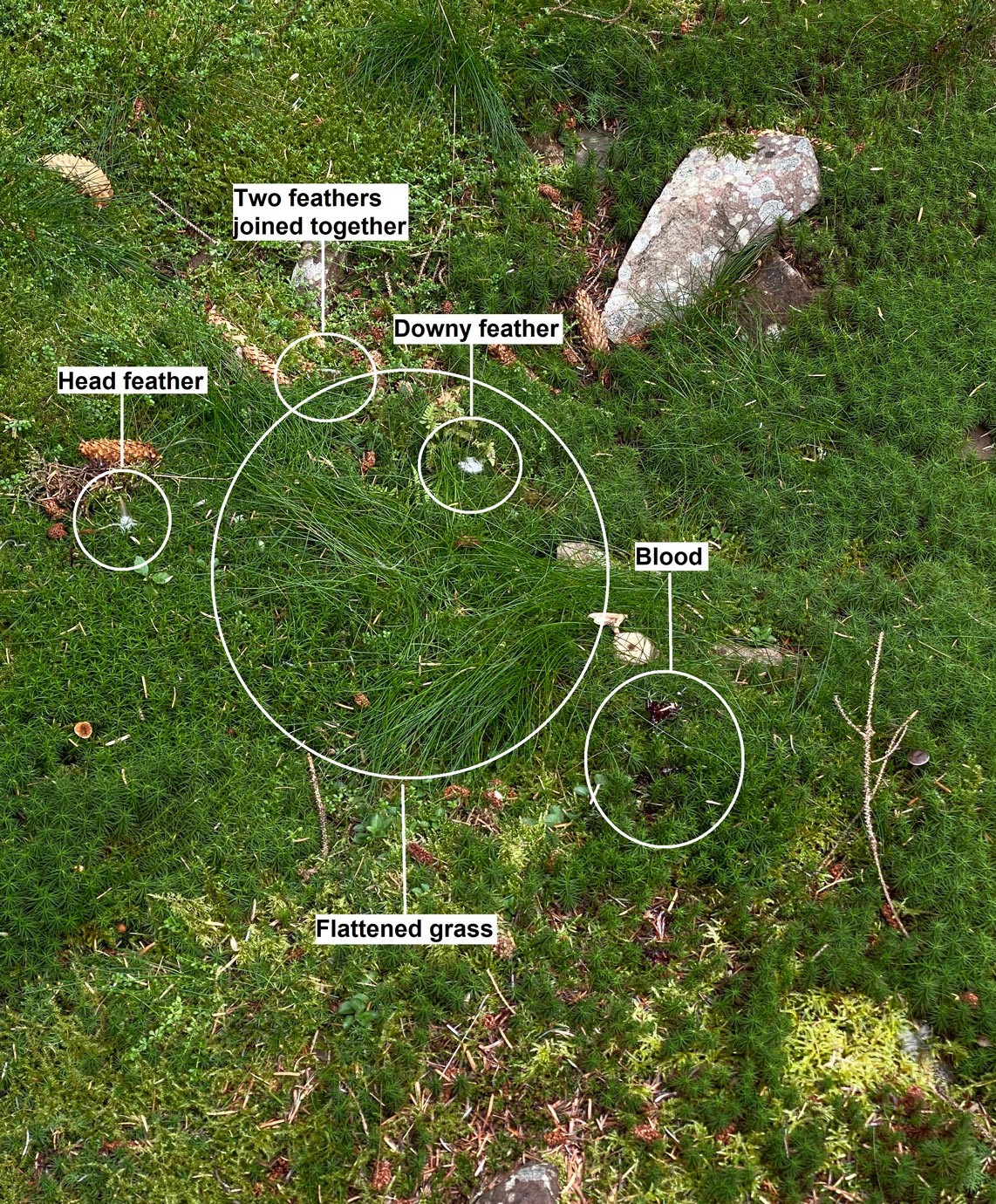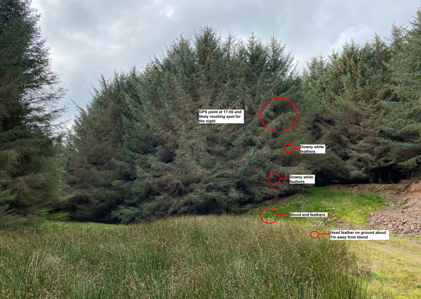 On a visit to check on a juvenile eagle in the area, Eagle Officer, John Wright, inspected the relatively bare branches of a Sitka Spruce, Merrick’s last known roosting spot. He very quickly noticed a small golden lanceolate shaped head feather, two small wing coverts and some white under-down laying on the moss directly below the tree. Recalling his visit to the site, John said: “I saw a film of blood stretched across the grass stems. It subsequently turned out that a considerable amount of blood was present in and below the moss layer. As I stood back from the feather and blood location, I could see small downy feathers scattered in the dense spruce foliage below the roosting branches.