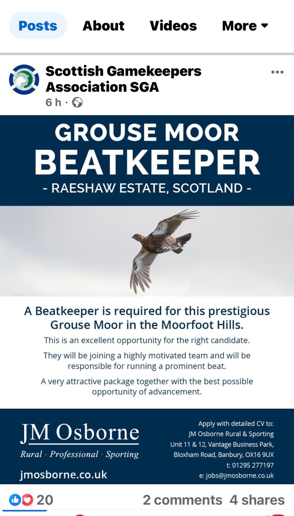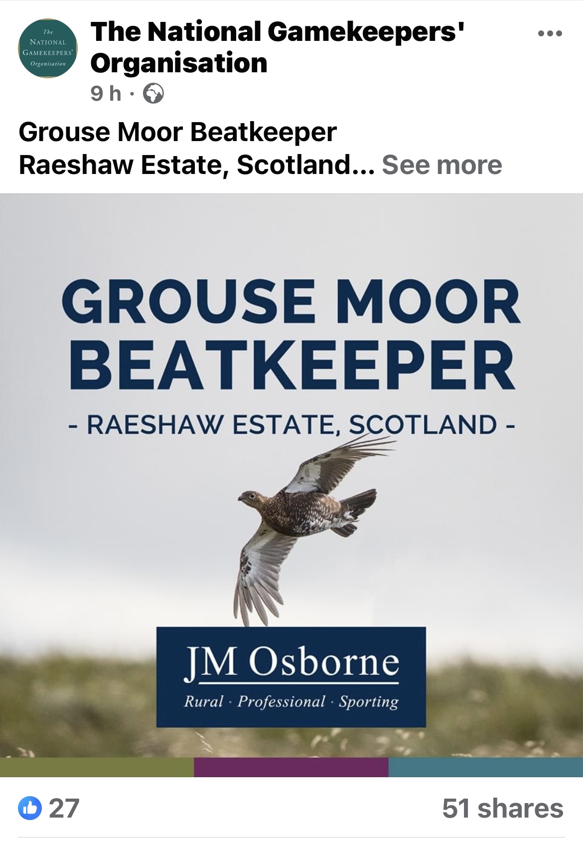 The sporting elements of the estate are managed by one of ‘grouse moor guru’ Mark Osborne’s companies, a sporting agency called ‘JM Osborne Rural and Sporting‘. Members of the grouse shooting industry, who you’ll recall routinely profess to have a zero tolerance policy towards raptor persecution, even in the press release above, clearly do not consider there to be any link with the apparent shooting and killing of Merrick and anyone employed on Raeshaw Estate. If they did, various gamekeeping organisations such as the Scottish Gamekeepers Association, National Gamekeepers Organisation, Southern Uplands Moorland Group and the Angus Glens Moorland Group wouldn’t this week be promoting on social media the latest gamekeeper vacancy on what is described as the ‘prestigious’ and ‘cracking’ Raeshaw Estate: