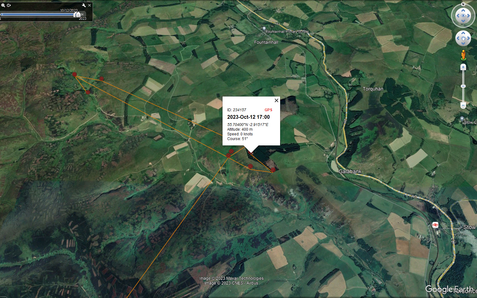 Each of the project’s eagles are fitted with a state-of-the-art satellite tag which transmits regular, reliable and accurate information about the birds’ wellbeing and movements. Until her disappearance, Merrick’s tag had been transmitting normally. During the eight days before her disappearance, she was exploring the Moorfoot Hills. Then on 12 October, her tag suddenly stopped transmitting, indicating “no malfunction”, which strongly suggested human interference.