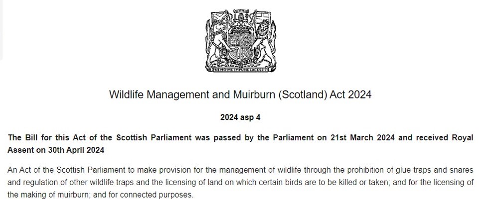 The Wildlife Management & Muirburn (Scotland) Bill, passed by the Scottish Parliament on 21 March 2024, has now become the Wildlife Management & Muirburn (Scotland) Act 2024 after receiving royal assent on 30th April.