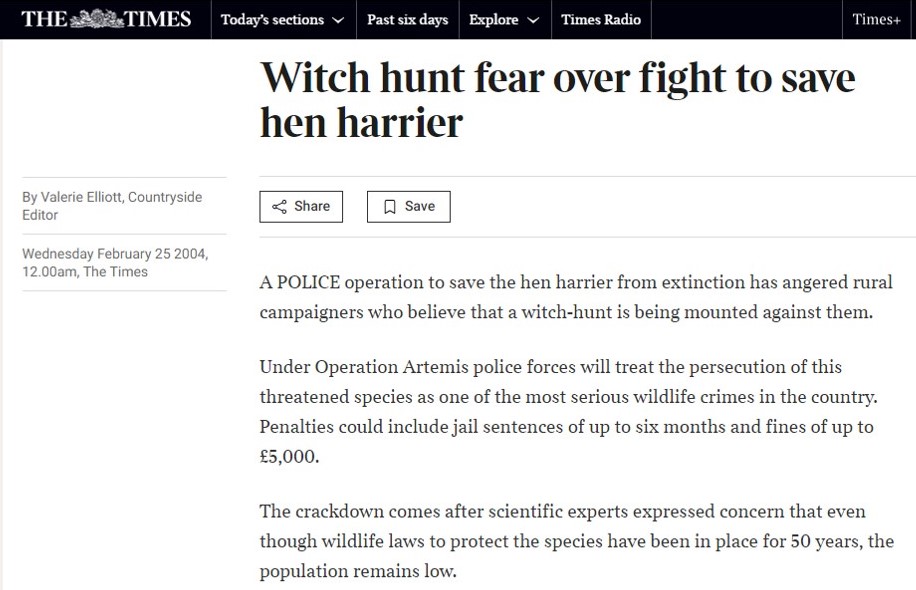 As described by the RSPB, Op Artemis was not well-received by the shooting industry, even resulting in an article published in The Times where the then Chief Executive of the Countryside Alliance, Simon Hart (who later became Chief Whip for the Conservatives) said the police operation was “part of a wider witch-hunt against gamekeepers“.