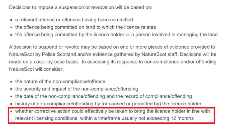 In fact the ‘ultimate’ appeal against NatureScot’s decision framework to impose a General Licence restriction, a judicial review brought by Raeshaw Estate, demonstrated that NatureScot’s framework was based on solid principles (see here) although I’d still argue that the GL restriction is only useful as a reputational driver, not as a serious sanction because sanctioned estates can simply apply to NatureScot for an individual licence that permits them to continue doing the activities that are supposedly forbidden under the General Licence restriction (see here for background discussion).