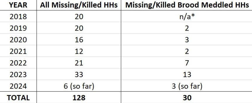 7 March 2024: Hen harrier male (brood meddled in 2023, name R2-M1-23) found dead in Devon. According to an FoI response from Natural England in June 2024 this death is the subject of an ongoing police investigation (here).
