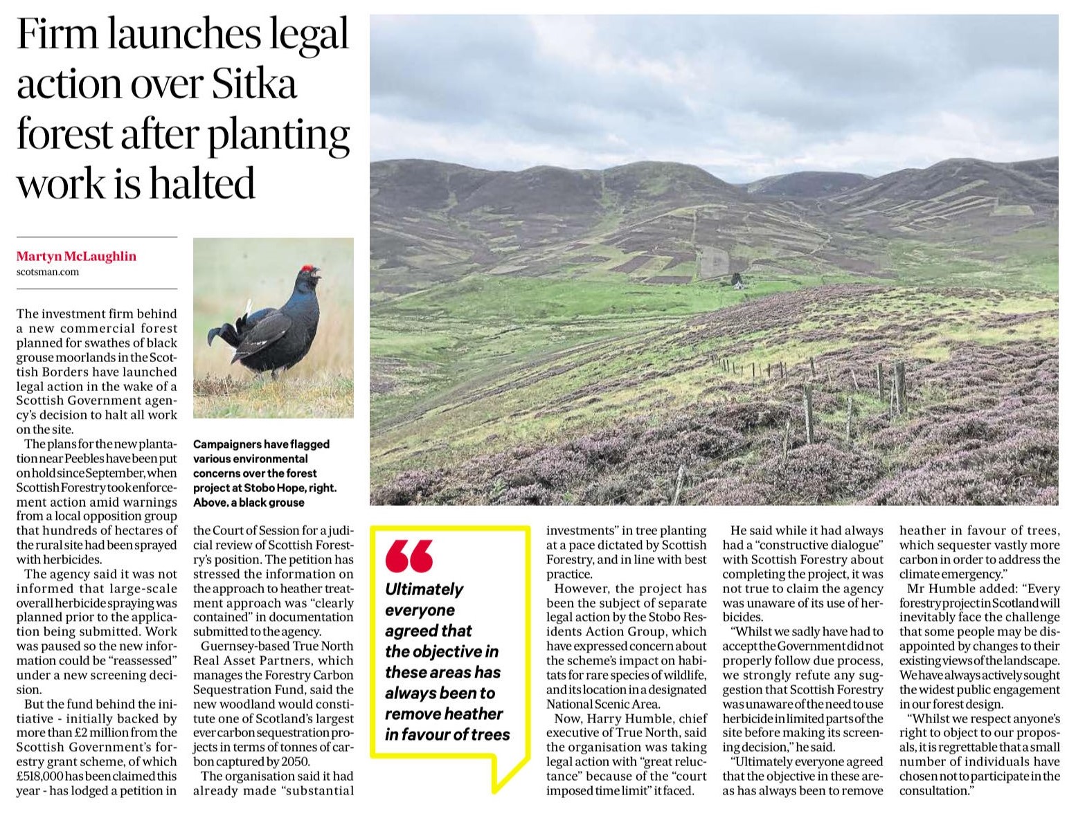 Today, in an exclusive article published in The Scotsman, it was revealed that the investment company behind the development of Stobo Hope, Guernsey-based True North Real Asset Partners, has lodged an application for judicial review against Scottish Forestry’s decision to halt the work.