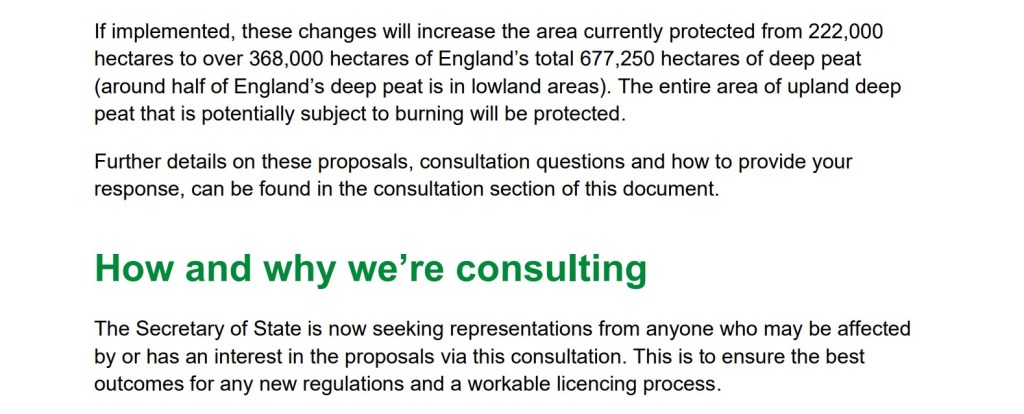 This is an important area of policy because England’s peatlands are of huge international importance. 80% of them are currently degraded, with rotational burning (typically on moorland managed for driven grouse shooting) being a contributory factor to that degradation in the uplands. Protecting peat from further damage is crucial to its restoration and recovery.