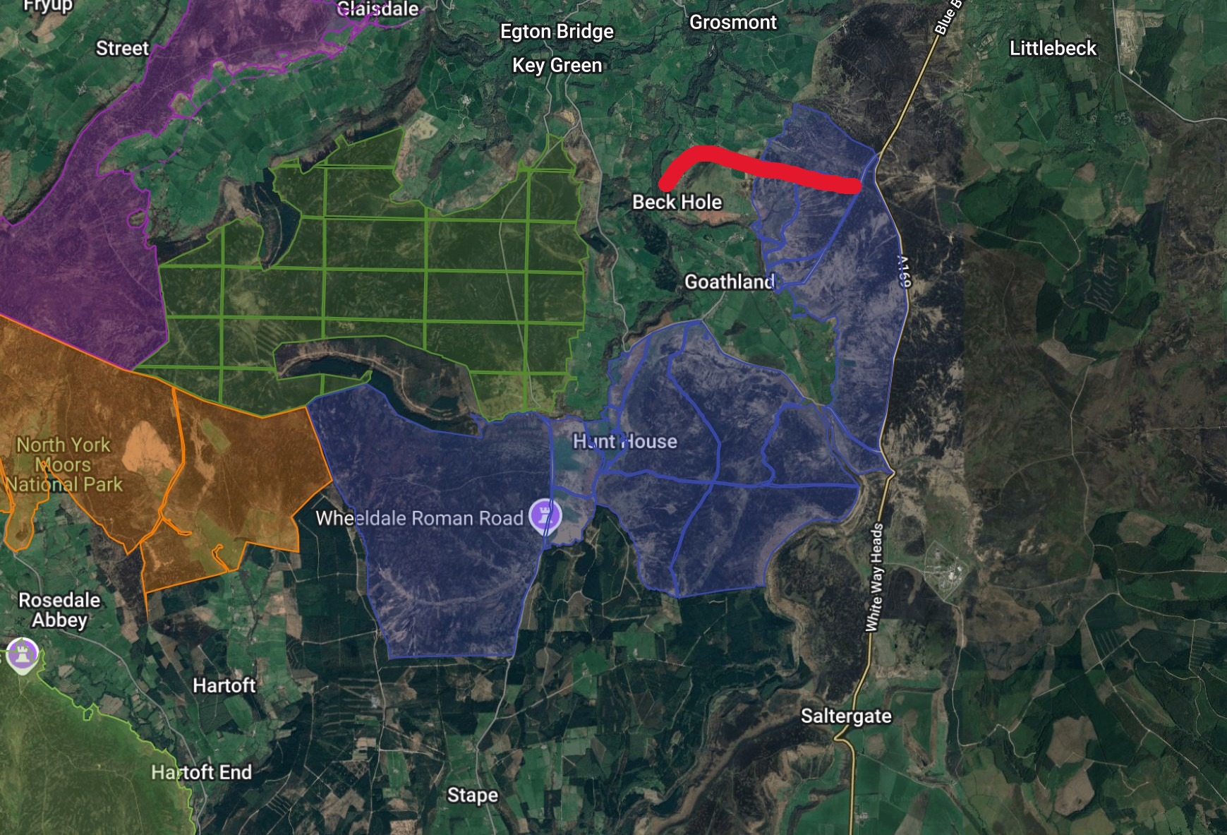 Here is an annotated map from Guy Shrubsole’s brilliant website Who Owns England, showing the extent of the Duchy of Lancaster grouse moors (purple) around Goathland. I’ve added the approximate location (in red) of the Beck Hole Road.