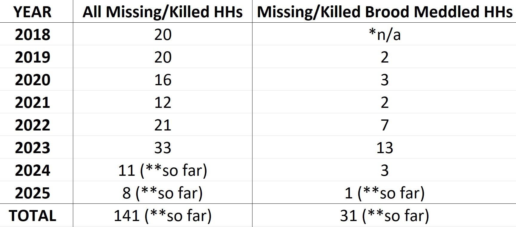*n/a – no hen harriers were brood meddled in 2018. **Post mortem reports on a further seven hen harriers found dead in 2024/2025 are awaited. Those seven individuals are not included in this table.
